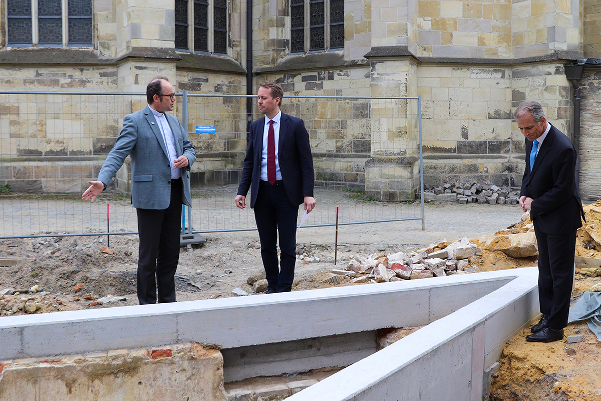 Am Rande der Eröffnung der Wanderausstellung „Spurensuche_n: Jüdisches Leben im Münsterland“ am 5. Mai in der Dülmener Viktorkirche besuchte Stefan Ast, der Geschäftsführer der NRW-Stiftung, auch die nahegelegene künftige Gedenkstätte „Keller Pins“. Zusammen mit dem Vorsitzenden des Dülmener Heimatvereins, Erik Potthoff, überzeugt sich Stefan Ast vom Fortgang der baulichen Arbeiten über der archäologischen Freilegung des ehemaligen Kellergeschosses vom Haus Kirchplatz Nr. 8. Die NRW-Stiftung sei beeindruckt, im Heimatverein einen gesellschaftlichen Akteur gefunden zu haben, der seit vielen Jahren auf kreative Weise die Dülmener Erinnerungskultur vorantreibe. Ast überreichte eine Förderurkunde über 20.000 Euro. Die Mittel sind für die neuen Publikationen über jüdisches Leben in Dülmen und den Gedenkort am „Keller Pins“ bestimmt. Insbesondere die Zusammenarbeit des Heimatvereins mit den Dülmener Schulen ziele „auf eine lebendige und sehr anschauliche Geschichtsvermittlung. Das hat uns in der Stiftung sofort für die Förderung überzeugt“, zeigte sich Stefan Ast beeindruckt.