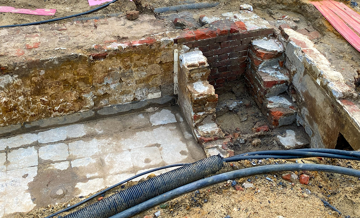 In verschiedensten Publikationen ist das markante Bild aus den 1930er Jahren schon veröffentlicht worden: Die Rede ist von der Dülmener NSDAP-Parteizentrale unweit von Rathaus und Löwendenkmal. Das frühere Café Wiesmann wurde ab 1933 von den örtlichen Nationalsozialisten als „Braunes Haus“ genutzt; ein markanter Schriftzug zierte die südliche Fassade. Welche Schrecken in dieser Institution ersonnen und verübt wurden, lässt sich nur erahnen. 1945 versank das Gebäude in Schutt und Asche, das Kellergeschoss blieb im Erdreich. Ab dem 18. Mai 2022 wurden von Dr. Gerard Jentgens und seinem Grabungsteam ein gekachelter Waschraum, Mauerwerk und Zementfliesen, verschiedene Leitungsrohre und ein Treppenabgang freigelegt.