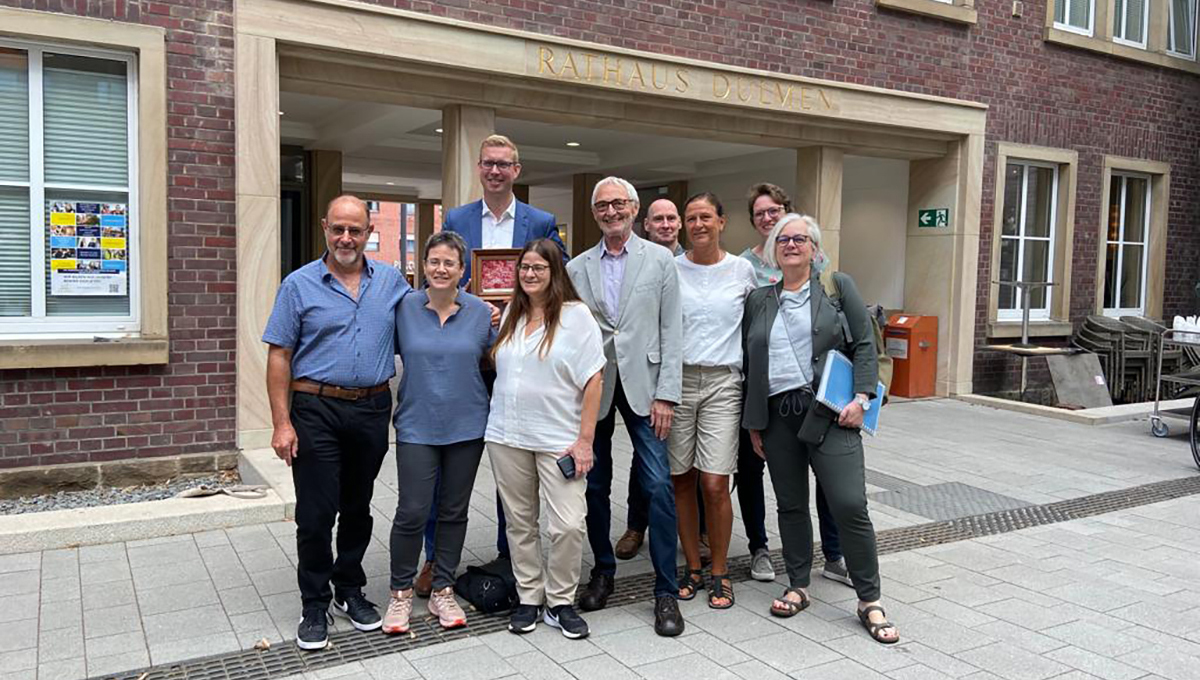 Gemeinsam mit dem Stadtarchivar Dr. Stefan Sudmann, den Pädagogen Theo Schwedmann, Dr. Andrea Peine und Gerda Küper machten sich die Gäste auf den Weg durch die Stadt >>> und besuchten den Innenhof an der Münsterstraße, wo einst die Synagoge stand, und hielten an den Stolpersteinen von Paula und David Dublon inne. Nach der Begrüßung durch Bürgermeister Carsten Hövekamp ging es vorbei am ehemaligen jüdischen Friedhof weiter zum jüdischen Friedhof >>>.