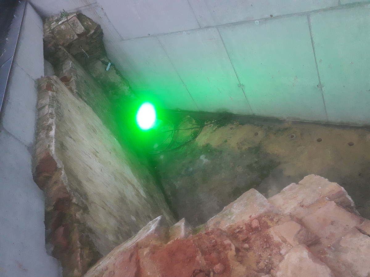 Um künftig eine günstige Feuchtigkeits- und Klimasituation im „Keller Pins“ zu erlangen, wurden nun Löcher in der Bodenplatte angelegt: Durch diese wird eindringendes Regen- oder Kondenswasser ins Erdreich geleitet und somit davon abgehalten, eine Bodenlache zu bilden. Mit Installation der in Planung befindlichen Einstiegsluke nebst Durchlüftungssystem wird zeitnah eine finale Lösung zur Vermeidung zu hoher Luftfeuchtigkeit im „Keller Pins“ erzielt.