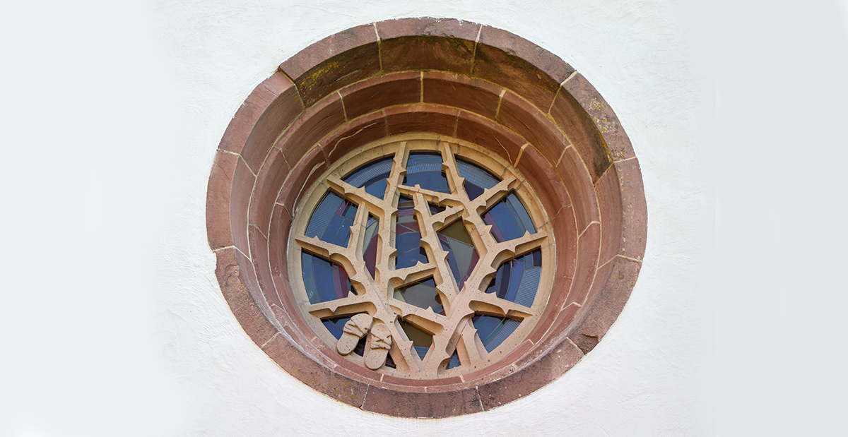 Am Samstag, 10. Juni 2023, unternahmen 35 Personen mit der Familienbildungsstätte (FBS) Dülmen eine Exkursion in die Nordeifel. Ein Höhepunkt war der Besuch im Kloster Steinfeld. Das dortige Westwerk der romanischen Basilika ziert ein Rundfenster, in das eine moderne Verglasung samt modernem Maßwerk eingelassen wurde: Es zeigt den brennenden Dornbusch mit den abgelegten Sandalen des Mose. Davon ist im Buch Exodus (Ex 3,1ff.) die Rede: „Komm nicht näher!“, sagte der Herr. „Zieh deine Schuhe aus, denn du stehst auf heiligem Boden.“ In Dülmen findet sich dieser Appell zur Ehrfurcht übrigens auf dem Gedenkstein am Alten Jüdischen Friedhof neben dem Lüdinghauser Tor, genauer: auf der bronzenen Platte von 1979 am Findling: „Der Ort, auf dem du stehst, ist heiliger Boden“ (Ex 3,5)