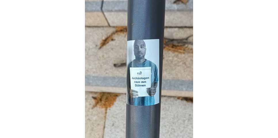 Seit geraumer Zeit verunstalten kleine Hochglanzaufkleber Straßenlaternen oder Haustüren in Dülmen. „Archäologen raus aus Dülmen“, so lautet die Botschaft. Das hier gezeigte Bild entstand am Treppengeländer an der Freitreppe von der Marktstraße zum Kirchplatz von St. Viktor. „Der traurige junge Mann auf dem Aufkleber ist vielleicht kein alteingesessener Dülmener“, so vermutet Pfarrer Markus Trautmann, „womöglich hat er bislang noch keine innere Beziehung zu unsere Stadt gefunden. Sonst wüsste er um die Bedeutung geschichtlichen Wissens für ein gesundes lokalpatriotisches Selbstbewusstsein, das uns nicht zuletzt die Archäologie vermittelt.“ Der Pfarrer bedauert die Anonymität der Angriffe, gern würde er den Austausch suchen. Und noch etwas anderes sei verstörend: „Es ist hierzulande eigentlich Konsens, auch die Leistungen der weiblichen Fachkräfte zu würdigen. Warum werden nicht die vielen engagierten Archäologinnen genannt?“