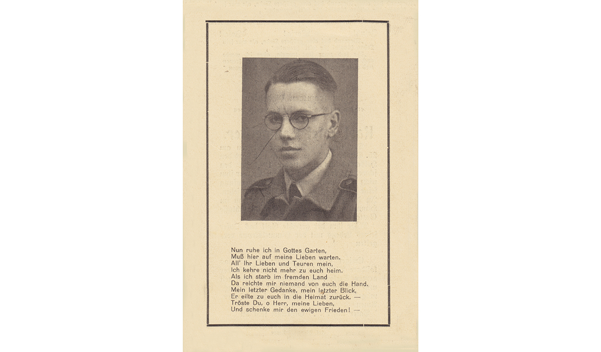 Als Karl Baumeister (1926-1944) am 8. Oktober 1944 bei der „Schlacht um Aachen“ ums Leben kam, fehlten noch rd. 14 Tage bis zu seinem 18. Geburtstag. Der Dülmener Junge war das zweite Kind von insgesamt vier Geschwistern (Maria, Karl, Ludger, Margret). Die Mutter war bereits gestorben, als die Kinder noch klein waren; der Vater hat die Kinder allein großgezogen. „Karl galt als sehr intelligenter Junge“, weiß Beate Telohe aus den Erzählungen ihres verstorbener Ehemanns zu berichten, der Nachbarjunge und Schulfreund von Karl Baumeister war. So haben die beiden Jungen mal eine selbstgebaute Telefonleitung zwischen den Nachbarhäusern verlegt. Nachdem Beate Telohe 1973 nach Dülmen kam, sei sie in den 70er und 80er Jahren jährlich am Karfreitag mit Margret, der jüngeren und unverheirateten Schwester von Karl Baumeister, nach Ysselsteyn gefahren, um das Grab auf der dortigen Kriegsgräberstätte zu besuchen und ein Blumengebinde abzulegen. Dass Karl Baumeister in den Niederlande begraben liegt, obwohl er im Großraum Aachen ums Leben kam, kann sich Beate Telohe nicht erklären; nach ihrer Erinnerung bzw. den Berichten der ebenfalls schon verstorbenen Margret Baumeister habe Karl gar auf nahegelegenem belgischen Gebiet den Tod gefunden. Wie auch immer: „All‘ Ihr Lieben und Teuren mein, / ich kehre nicht mehr zu euch heim“, steht auf dem Totenbild.