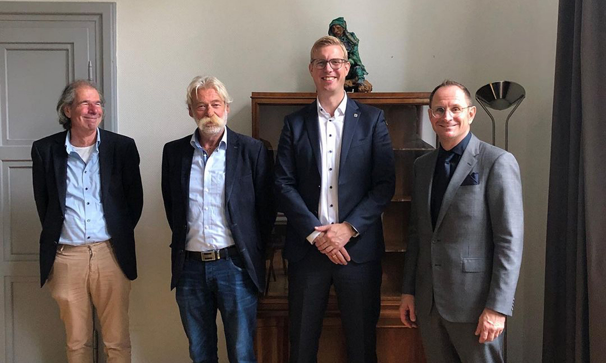 Anlässlich des 50-jährigen Bestehens der Hermann-Leeser Schule kamen am 29. September 2023 Herman Soetermeer (Sohn von Hermann Leesers Tochter Ingrid) und Joost Becker (Sohn von Hermann Leesers Tochter Helga) zur Geburtstagsfeier an die Hermann-Leeser-Schule und brachten ein Bild ihres Großvaters mit. Bürgermeister Carsten Hövekamp und Schulleiter Robert Schneider begrüßten die beiden Ehrengäste.