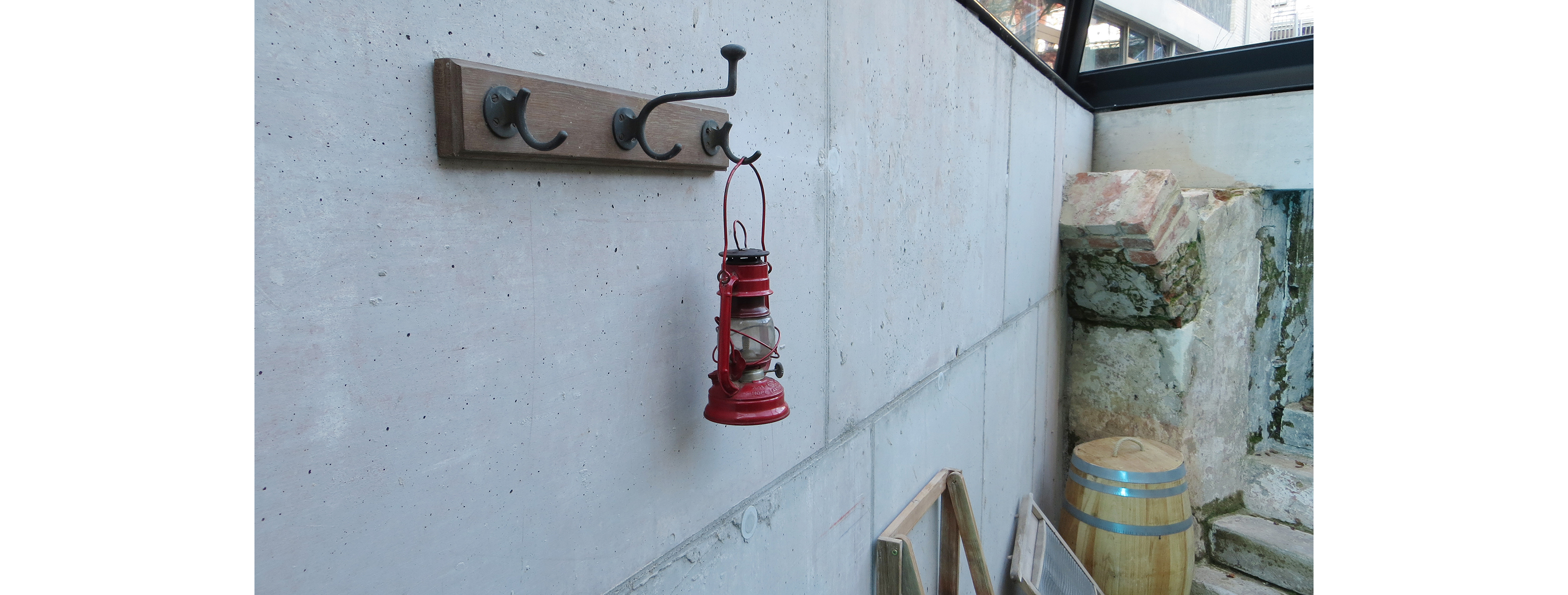 Nach genau drei Jahren, seitdem im März 2022 eine moderne Betonwand in das historische Kellergeschoss des Hauses Pins eingezogen wurde, wird eben diese Wand neuerdings durch einen historischen Kleiderhaken verziert. Genaugenommen sind es drei gusseiserne Haken an einem Holzbrett. Diese sogenannten „Hakenleiste“ aus der Zeit vor dem Zweiten Weltkrieg ist eine Schenkung des Antiquitätengeschäfts Brock >>>, Coesfelder Straße 103 in Dülmen.